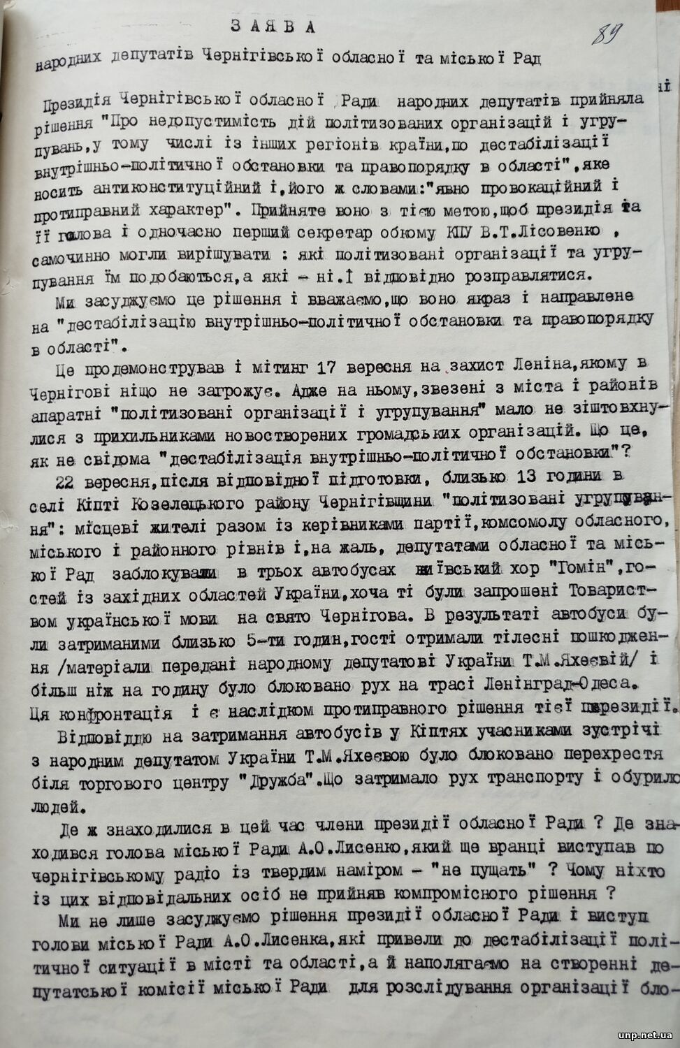 З архіву Чернігівської обласної організації НРУ(УНП), нині Музей боротьби за відновлення незалежності України на Чернігівщині.: